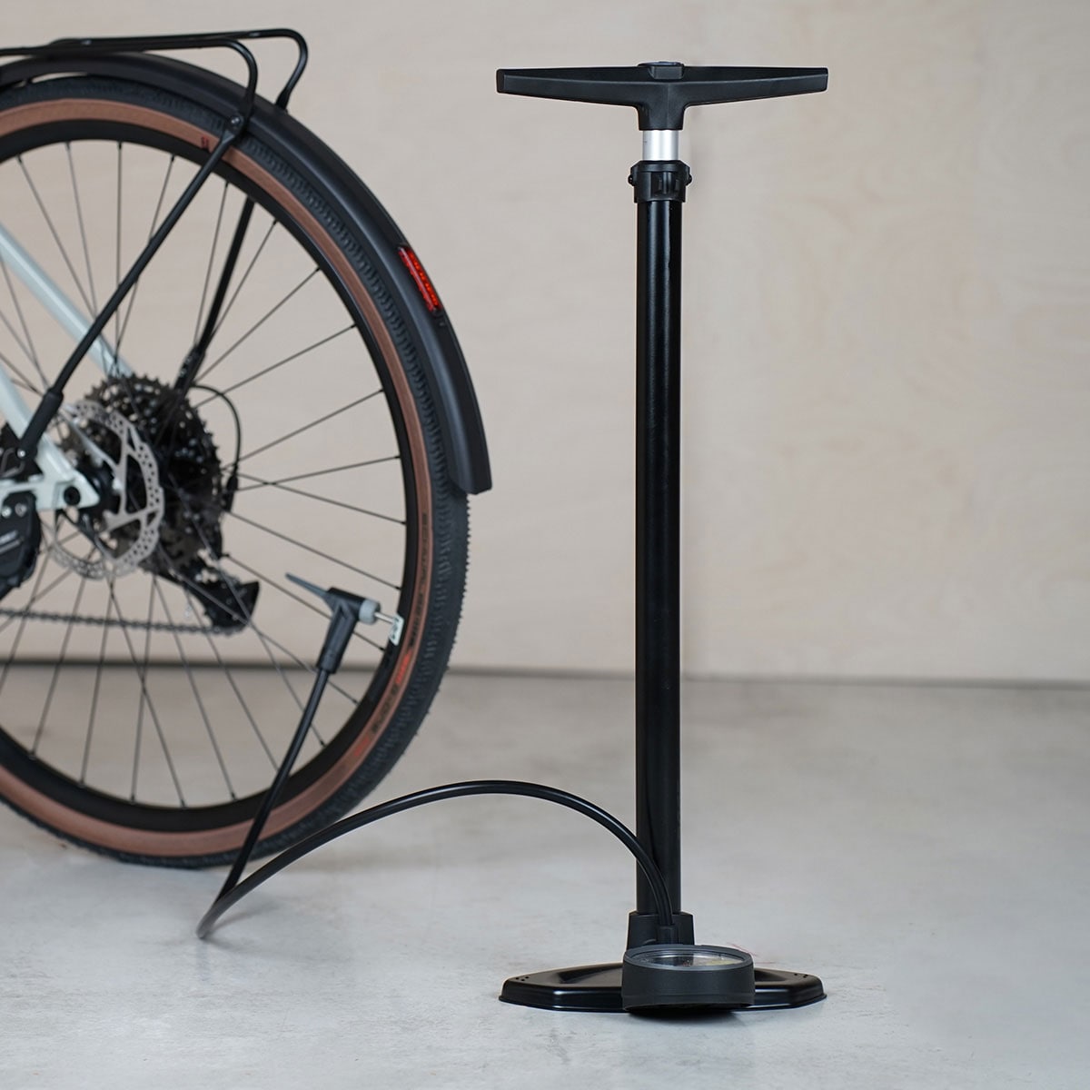 • Material: steel (barrel, base), aluminium (piston), plastic (handle, pressure gauge housing, pump head), rubber (hose)